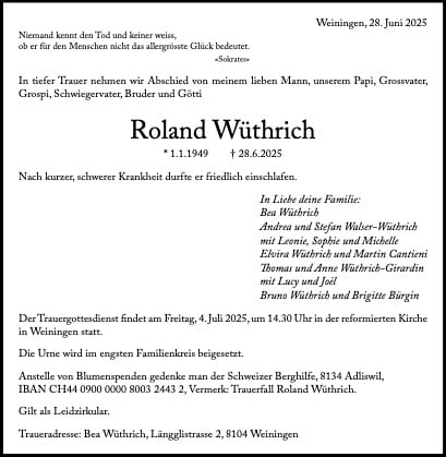 Dabei ist auch seiner Familie für ihr Verständnis für die Zeit zu danken, die Roli für die SVP sowie all die Vereine und Engagements aufgebracht hat. Mit Roli konnte man auch mal über Persönliches reden und jederzeit einen Rat einholen. Er konnte zuhören und hatte immer eine Lösung oder einen Vorschlag bereit. Aber zuoberst stand trotz all seiner vielen Engagements und Hobbys seine Familie. Er war ein liebevoller und unvergesslicher Vater und Ehemann.