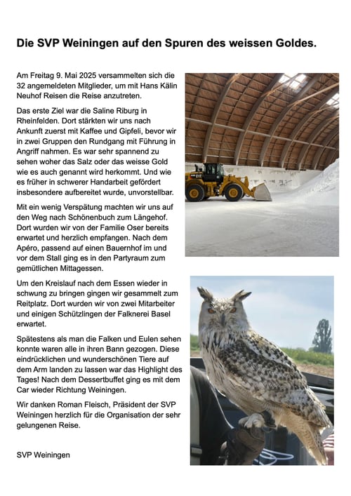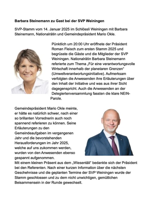 Am 7. März 2025 trafen sich die Mitglieder der Ortspartei Weiningen zu ihrer jährlichen Generalversammlung im Schlössli. Nach dem Begrüssungsapero im nostalgischen Sitzungszimmer begab sich die Schar in den grossen Saal, wo schon für den Abend festlich aufgedeckt wurde. Pünktlich um 19:00 Uhr eröffnete Roman Fleisch seine erste GV als Präsident. Für den Jahresbericht 24 erdachten sich alt Präsident Roland Wüthrich und sein Nachfolger mal etwas anderes aus und teilten den Jahresbericht auf. Jeder für seine Dauer 24/25, da im Herbst 24 in einer ausserordentlichen GV der Präsident neu gewählt wurde. Die Anwesenden hörten dem unterhaltsamen und mit Witz bestückten Jahresbericht zu.